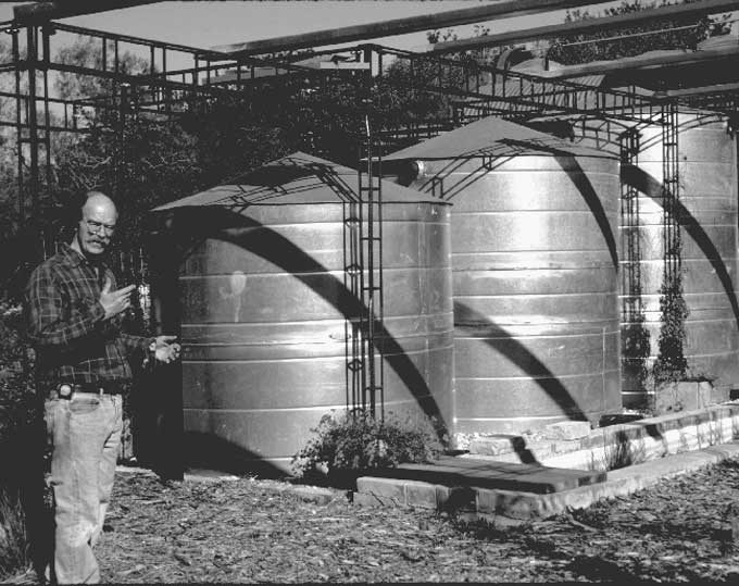 Researcher and EBN Advisory Board member Pliny Fisk in front of cisterns at the Center for Maximum Potential Building Systems in Austin.