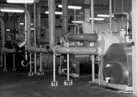 Use of efficient chillers such as this EarthWise™ CenTraVac from The Trane Company may be a justifiable way to combat global warming in spite of their use of ozone-depleting HCFCs, as the units are designed to keep refrigerant releases below 0.5% per year. This unit achieves very high efficiencies using a multiple-stage compressor with three impellers.