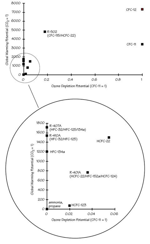 Global warming figures assume a 100-year time horizon. Data from “Heat Pump Working Fluids: An International Overview” by Bert Stuij, published in the IEA Heat Pump Centre Newsletter,