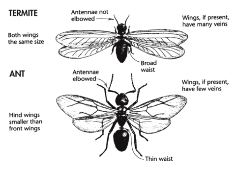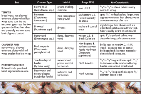 Swarming Formosan termites — photo courtesy of USDA-ARS Termites, carpenter ants, and powderpost beetles eat wood or tunnel through it for nesting cavities, thus causing structural damage. The most common species of these insect pests are described in the table on right.