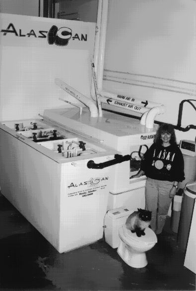 A third type of composting toilet is more high-tech. The AlasCan composting toilet and graywater treatment system was introduced in the late 1980s for use in permafrost regions and is more automated and “lifestyle independent” than other composting toilets—but also more complex and expensive. An ultra-low-flush toilet is used to deliver wastes to a tank located in the basement. Kitchen food wastes are delivered to the composting toilet after shredding in a garbage disposal, and additional wood chips or coarse sawdust is added. In the heavily insulated tank, bacteria, worms, and other organisms break down organic matter. There is a water recirculation system that collects water at the bottom of the tank and returns it to the organic matter. Automatic agitators mix and aerate the material, and an air-to-air heat exchanger exhausts air and delivers preheated fresh air. Total system cost for an AlasCan toilet and graywater system is $9,000 to $10,000, plus shipping and installation.