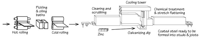 Sheet steel for framing is hot-dip galvanized. The rolled steel is coated as it goes through a bath of molten zinc. Steel framing members are typically 3% to 5% zinc by weight.