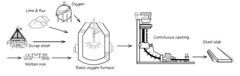Large quantities of oxygen (separated from ambient air at the steelmaking facility) are also used, and supplemental heat comes from fuel oil or natural gas.