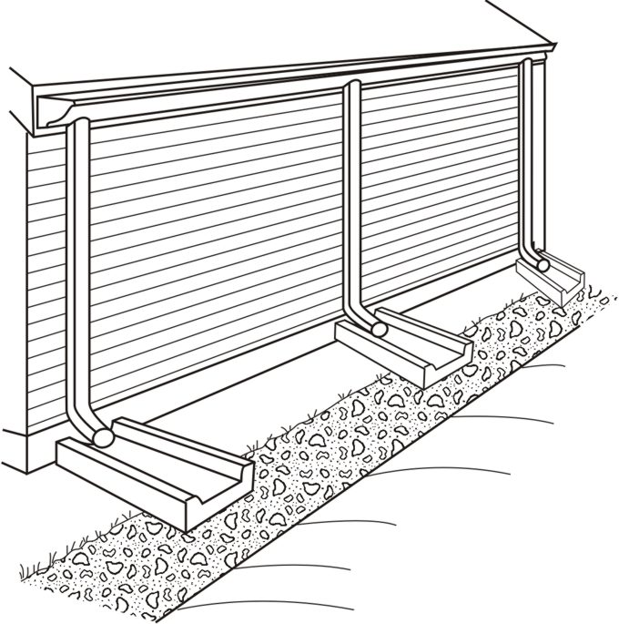 If gutters are installed without a water catchment system, provide multiple downspouts.