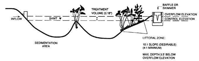 26.Dry detention pondsDry detention ponds are a common feature of stormwater management systems. They temporarily hold stormwater during periods of heavy rainfall to prevent flooding downstream. Stormwater is channeled into the pond, and an outlet structure provides for gradual release of the water during and after the storm event. Most detention ponds are designed to dry out completely between storm events. Because of the short water-retention time, dry detention ponds are not very effective at removing pollutants. Extended detention ponds that hold water for longer periods of time are generally better because more sediment can settle out and because downstream flooding will be reduced during and right after storms.