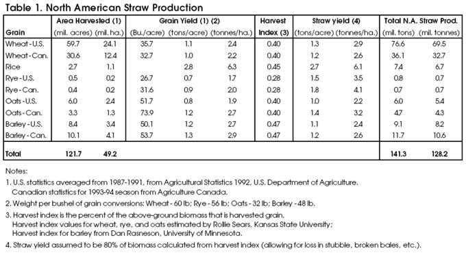 Straw is what’s left over when grains, such as wheat, rice, barley, oats, and rye, are harvested. About 140 million tons (128 million tonnes) of straw are produced each year in North America (see Table 1).