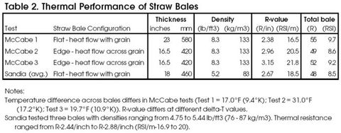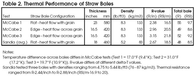 If we average the results from these two sets of tests, we come up with values of about R-2.5 per inch (RSI/m-17.3) when bales are stacked flat (heat flow with the grain of the straw), and R-3 per inch (RSI/m-20.8) when bales are stacked on edge (heat flow against the grain). Note that testing to date has produced quite variable results, so these values can only be rough approximations. The bottom line, though, is that bales insulate extremely well.