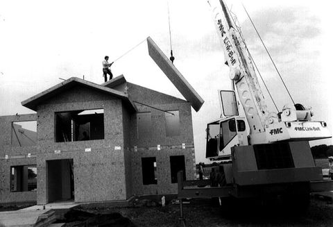 A number of companies are pursuing the idea of gluing several Stramit-type panels together, adding protective facings, and using the panels as structural insulated panels that can be used as the exterior envelope of buildings. In an attempt to restart production, Pyramod Industries has erected several prototype houses (see photo on page 16) using panels that have been stockpiled since their factory shut down in the 1980s.