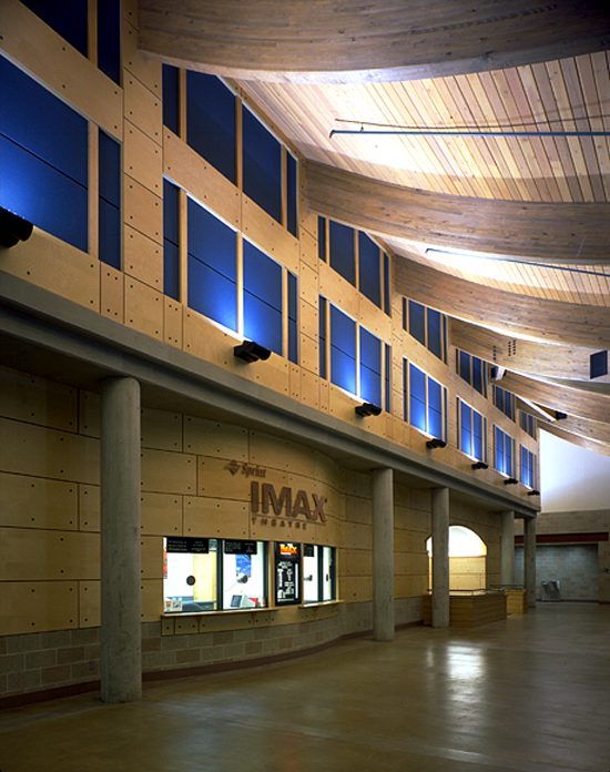 The Kansas City Zoo’s Deramus Educational Pavilion includes an IMAX theatre and a large exhibit area on either side of a tall, daylit entry hall.