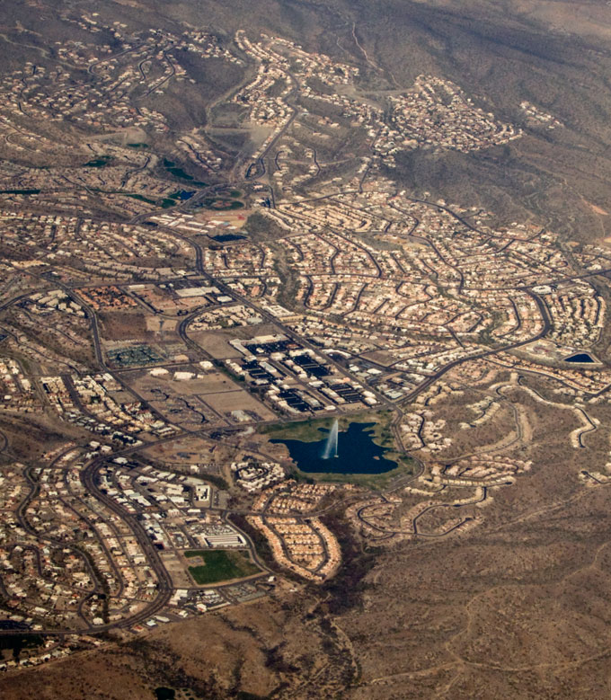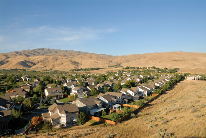 In Boise, Idaho, with annual precipitation of 12 inches (300 mm), irrigated lawns provide a stark contrast to the arid surroundings.