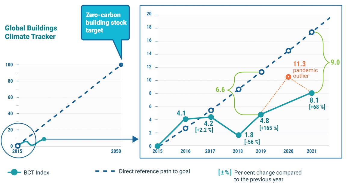 In last year’s report, GlobalABC’s sixth, our climate-tracker score came closer than ever to the required trajectory for 2020. Even at the time, though, report authors believed this was caused by pandemic lockdowns, which had shut down building operations and much of the construction industry. They were right; we’re worse off than ever now. “The gap between the actual decarbonization performance and the desired pathway has been widening since 2018,” according to the report authors.