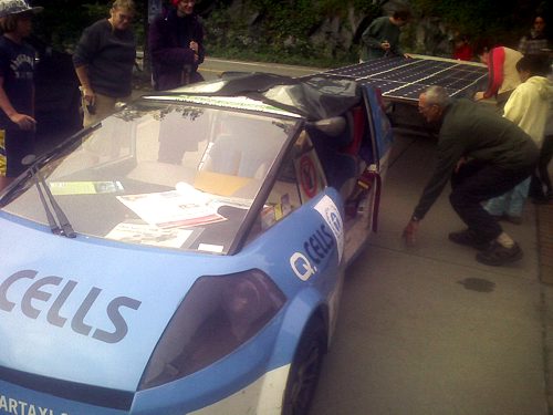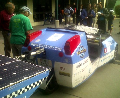 Since leaving Switzerland in the beginning of July in 2007, Louis Palmer has driven his solar-powered, three-wheeled, two-seater car around the world. Yesterday morning — a few days after giving a lift to the UN Secretary General in New York City (who afterward said "I hope I can enjoy another ride") — the Solartaxi came through our little town of Brattleboro, Vermont... the long road through Europe, the Middle East, India, China, Asia, New Zealand, Australia, and the United States nearly at its end. The tour will be over in December at the United Nations Climate Change Conference in Poland.