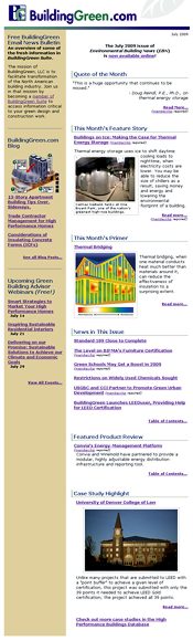 The July 2009 issue of Environmental Building News (EBN) is now available online! Quote of the Month"This is a huge opportunity that continues to be missed." —Doug Reindl, P.E., Ph.D., on thermal energy storage (membership required) This Month's Feature StoryBuildings on Ice: Making the Case for Thermal Energy Storage. Thermal energy storage uses ice to shift daytime cooling loads to nighttime, when electricity costs are lower. You may be able to reduce the size of chillers as a result, saving money and energy and lowering the environmental footprint of a building. (membership required) This Month's Primer Thermal Bridging. When one material conducts heat much better than materials around it, can reduce the effectiveness of insulation to a surprising extent. News in This Issue· Standard 189 Close to Complete· The Level on BIFMA's Furniture Certification (membership required)· Green Schools May Get a Boost in 2009 (membership required)· Restrictions on Widely Used Chemicals Sought· USGBC and CCI Partner to Promote Green Urban Development (membership required)· BuildingGreen Launches LEEDuser, Providing Help for LEED Certification Table of Contents... Featured Product ReviewConvia's Energy-Management Platform. Convia and Wiremold have partnered to provide a modular, highly adjustable energy distribution infrastructure and reporting tool. (membership required) Table of Contents... Case Study HighlightUniversity of Denver College of Law. Unlike many projects that are submitted to LEED with a "point buffer" to achieve a given level of certification, this project was submitted with only the 39 points it needed to achieve LEED Gold certification. The project achieved all 39 points. Check out more case studies in the High Performance Buildings Database... BuildingGreen.com Blog· 13-Story Apartment Building Tips Over. Sideways.· Trade Contractor Management for High Performance Homes· Considerations of Insulating Concrete Forms (ICFs) See all Blog Posts... Upcoming Green Building Advisor Webinars (Free!)· Smart Strategies to Market Your High Performance Homes, July 14