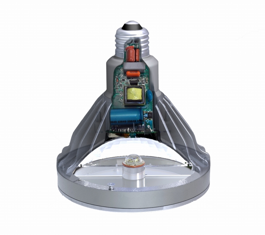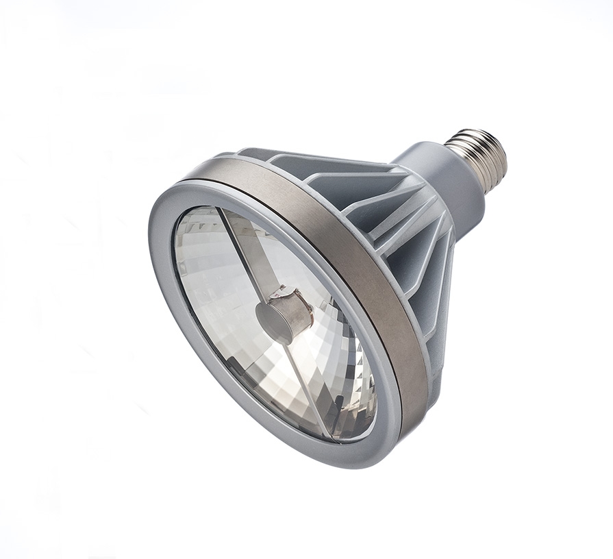 Cree makes both the actual LED light source used in the product and the lamp (light bulb) itself. It mixes light from red and yellow LEDs to produce the warm-white light, and that light is reflected outward with a many-faceted reflector. The lamp is self-ballasted and has a sophisticated thermal management system (needed with LEDs, because heat has to be conducted away from the actual LEDs). It relies on both a heat-pipe system and aluminum fins to dissipate that heat. With all these components, the LRP-38 is quite heavy--nearly 1 lb, 5 oz, from my measurement.