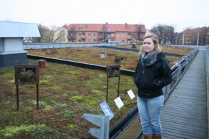 The institute is a centerpoint of the Augustenborg neighborhood. This neighborhood of affordable housing was created in the late 1940s in a depressed part of Malmo with an unemployment rate of about 65%. The multifamily housing units were quite modern in their day, but deteriorated over the years. Efforts to retrofit them for energy conservation in the 1970s and '80s caused moisture damage, and flooding has been a frequent problem in the low-lying area. In the 1990s, two local political and business leaders in Malmo began an effort to rejuvenate the neighborhood, and they centered the effort around the emerging concept of green (vegetated) roofs. Augustenborg's Botanical Roof Garden project was launched in 1998, and the roof garden construction began in May, 1999. This is the world's first demonstration roof garden, according to superintendent Louise Lundberg, whom we met with.