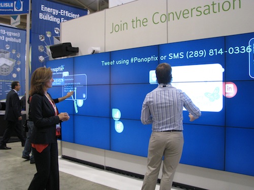 I am going to post more about this as well as a related Microsoft pilot project later and also write about both in an upcoming Environmental Building News feature about occupant engagement, but for now I wanted to share a photo showing the giant screen that Johnson Controls has set up on the floor to help generate buzz about Panoptix. The new tool has two really exciting features, at least from my point of view.
