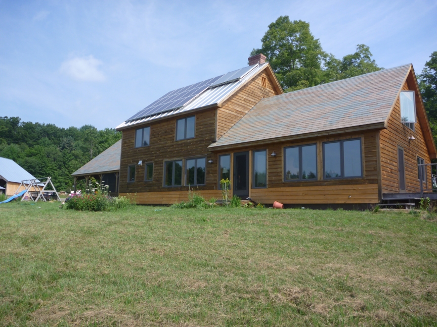 A passive solar home in Halifax, Vermont. High-SHGC, triple-glazed, south-facing windows were used to improve the direct-gain passive solar performance. Click on image to enlarge.