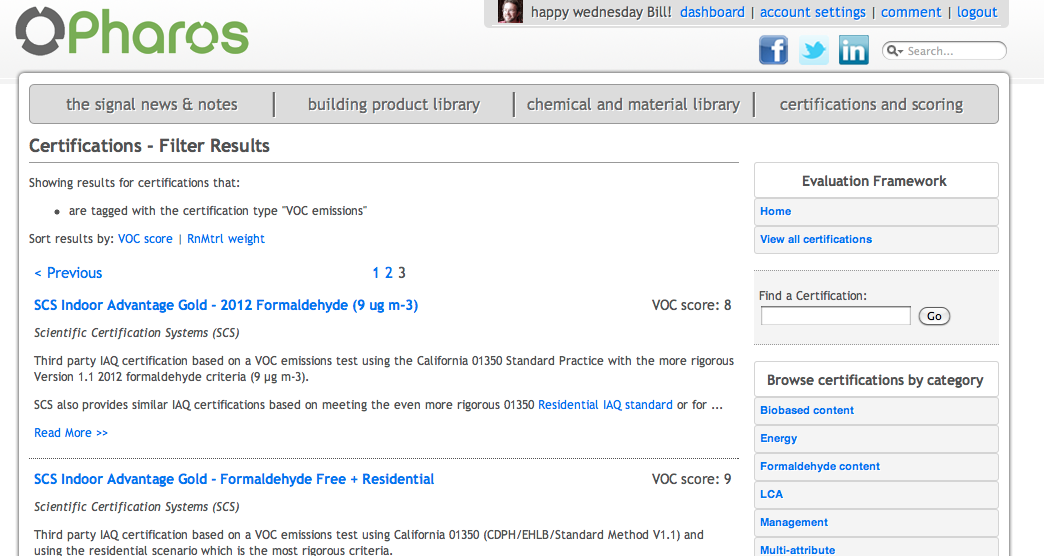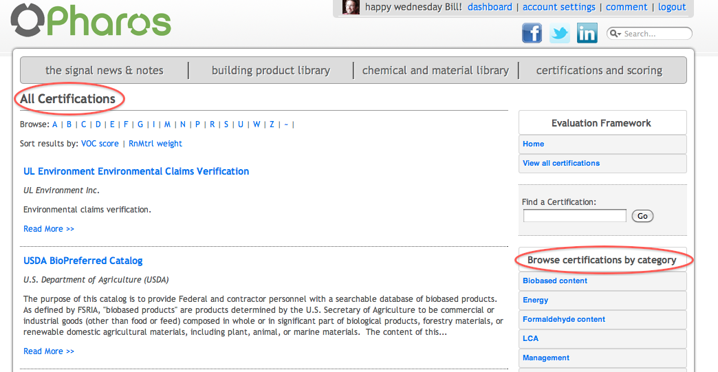 If you want products certified to a specific standard, you can find the certification standard you are looking for on Pharos's certifications page or, alternatively, simply type the name of the standard into Pharos's search function. Once on the page for the standard you want, click on the tab labeled "Products with this certification in Pharos" and voila.