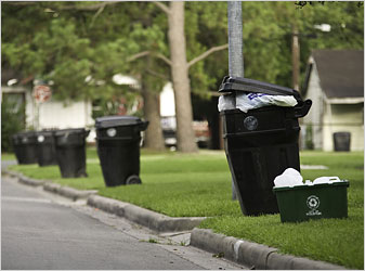 The city's sprawling, no-zoning layout makes collection expensive, and there is little public support for the kind of effort it takes to sort glass, paper and plastics. And there appears to be even less for placing fees on excess trash. "We have an independent streak that rebels against mandates or anything that seems trendy or hyped up," said Mayor Bill White, who favors expanding the city's recycling efforts. "Houstonians are skeptical of anything that appears to be oversold or exaggerated. But Houstonians can change, and change fast." High fuel costs do not help either. "I'm not going to send my truck 50 miles to pick up one can," said Chris Hickman, a recycling manager at Waste Management, the nation's largest waste company, whose headquarters is here. ...Private businesses, like office towers, apartment complexes, and restaurants, are responsible for their own garbage, although advocates of recycling are pleading with the city to regulate them. Commercial recyclers say that despite a recent increase in public interest, their services remain a tough sell.