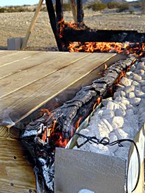 After in excess of two hours' heat source contact, Timbersil has suffered some charring. The control structure behind it has burned completely.