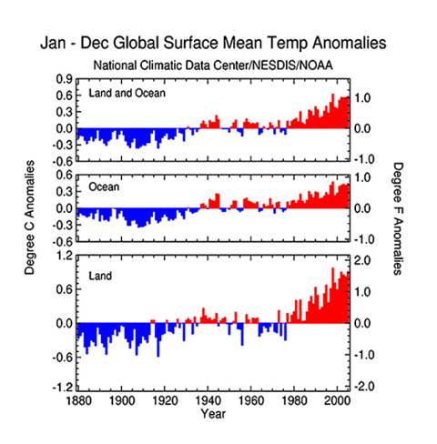 These graphs from the National Oceanic and Atmospheric Administration show a significant warming trend of over 1°C (1.8°F) since 1910. Also evident is the fact that land temperatures are more variable on an annual basis than ocean temperatures, due to the heat storage capacity of water.