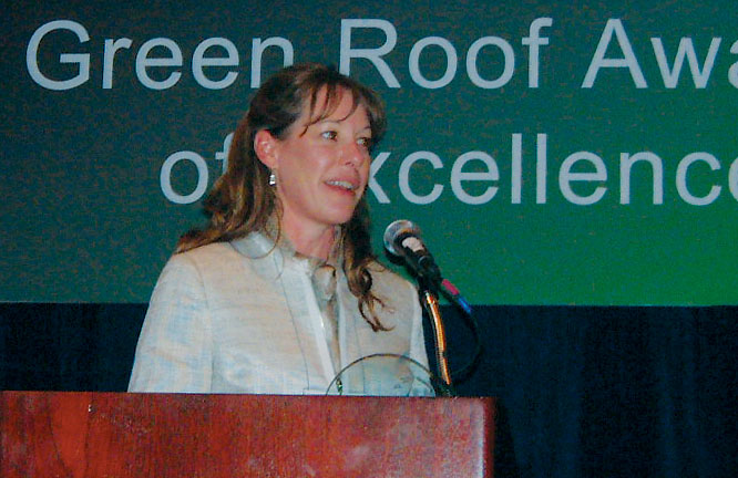 Karen Moyer, environmental coordinator with the Environmental Services Department of the City of Waterloo, Ontario, was recognized for her “outstanding contribution to her community and the development of the green roof industry.”