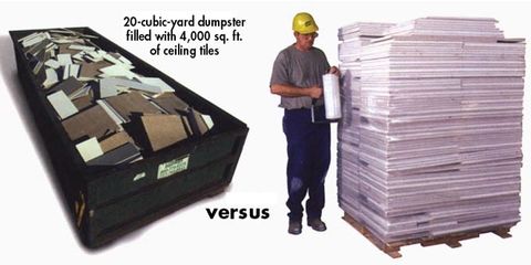 The dumpster load of ceiling tiles is headed to the landfill, while the pallet load is headed to Armstrong for recycling. At the new General Motors Tech Center in Warren, Michigan, 4.4 million ft2 (410,000 m2) of ceilings are being recycled at Armstrong facilities. New replacement tiles have a recycled content of 79%.