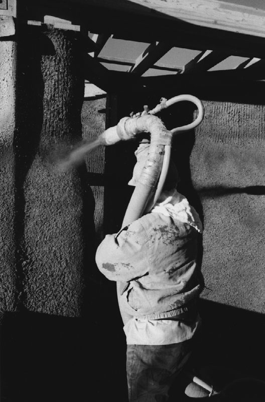 About 400 linear feet (120 m) of wall are 8’ high straw-bale walls covered inside and out with several inches of pisé (a pneumatically applied earth/cement mixture) by Rammed Earth Works.