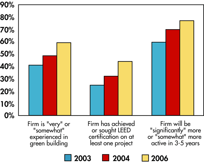 These survey results, adapted from the Building Design + Construction white paper “Green Buildings and the Bottom Line,” illustrate the changing levels of green building activity and expectations among respondents.