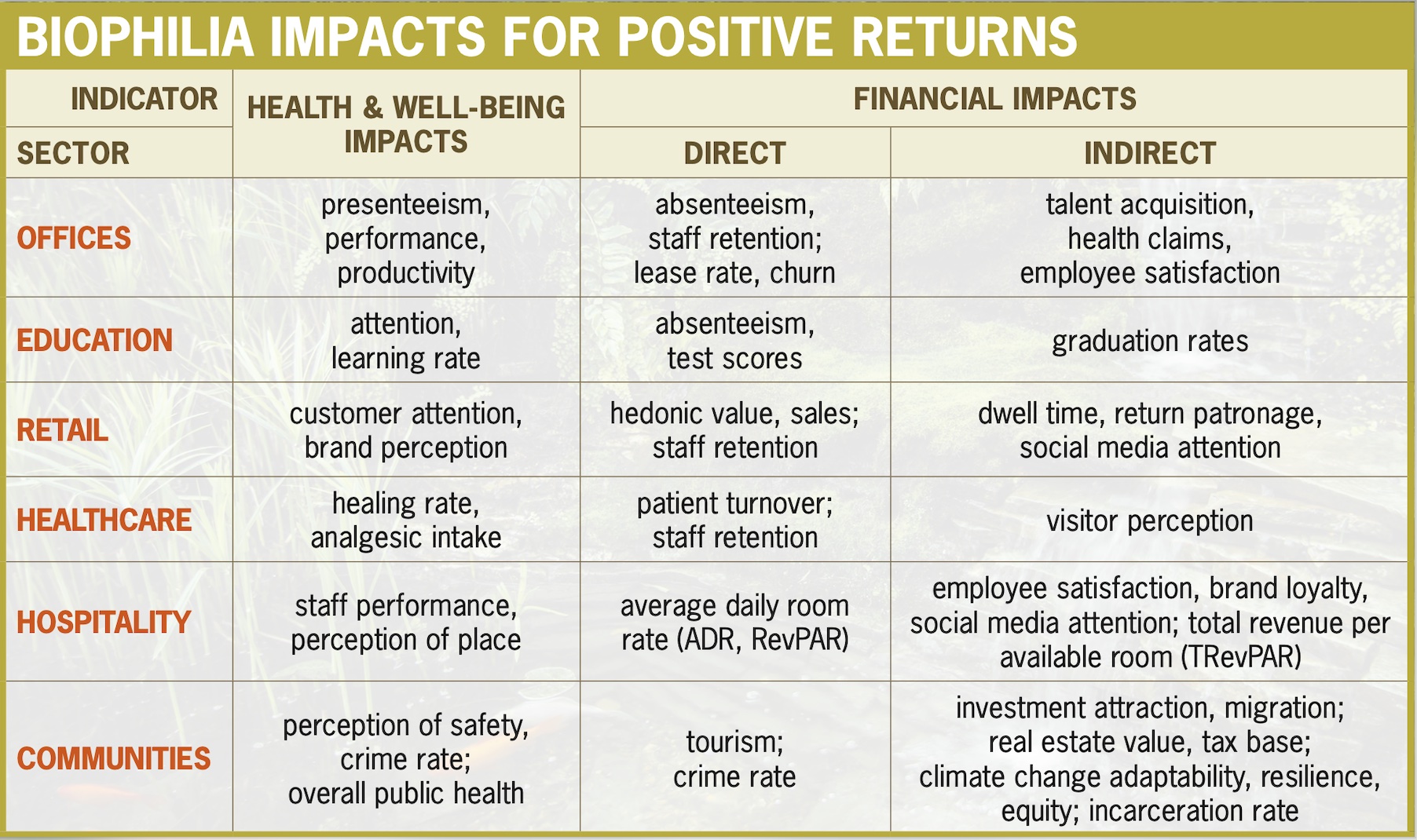 The financial return of biophilia can be measured in many ways; a stronger case can be made by combining multiple impacts.