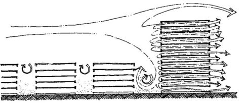 Graphic from Climate Considerations in Building and Urban Design illustrating the increased wind speed caused by a high-rise building helping to dilute street-level air pollution.