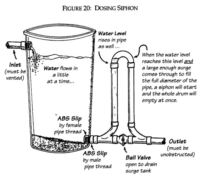 Illustration fromCreate an Oasis with Greywatershowing an ingenious siphon system for graywater surge tanks. The booklet cautions that getting this design to work properly can be tricky.