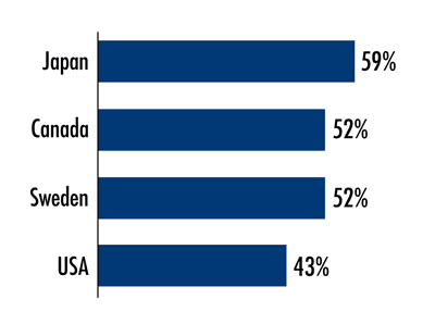 GE Capital Real Estate Survey, conducted during 2010, included more than 2,220 participants—office tenants from the U.S., Canada, France, Germany, Sweden, the U.K., Spain, and Japan. Fifty percent of all participants ranked green building initiatives as a high priority, with higher numbers found in Japan, Canada, and Sweden. The U.S. had the lowest percentage, with 43%. Among the green building priorities included in the survey, the top priority for tenants in most countries was energy efficiency, with waste reduction programs and indoor air quality coming next. In Sweden, the UK, and Spain, green rating certifications are considered a valuable factor, with scores averaging 48%—while only 40% of U.S. tenants ranked certifications as valuable. The survey concludes that commercial office tenants increasingly prefer spaces with sustainability initiatives. See also “Non-Green Office Buildings Sacrifice 8% in Rent Revenues,”