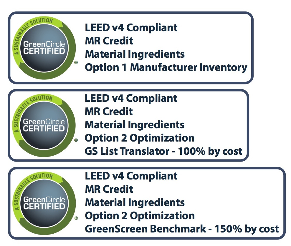 These certification marks will appear on manufacturer inventories and GreenScreen documentation—simplifying research for project teams as well as for LEED submittal reviewers.“LEED v4 Compliant” Labels