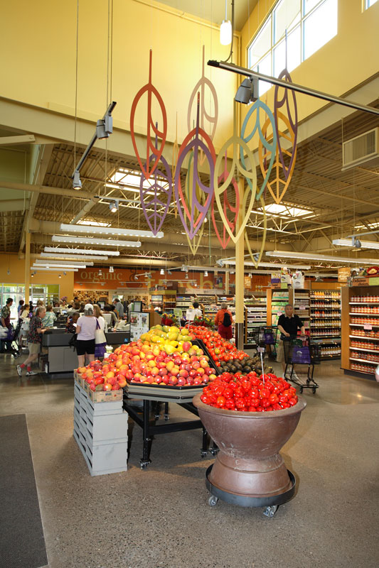 Clerestory windows and skylights bring daylight into this LEED Gold grocery store in Redmond, Washington, lessening the need for artificial light and saving energy.