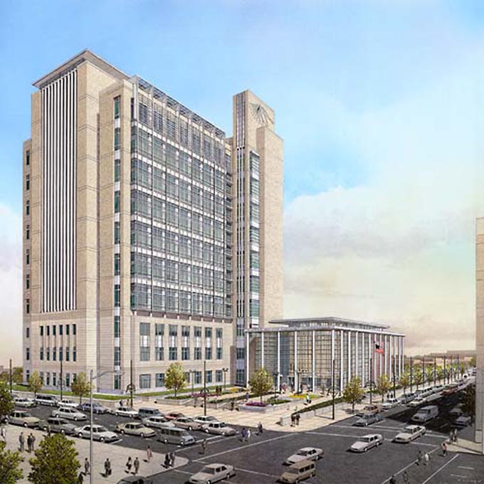 The U.S. District Courthouse Annex under construction in Denver incorporates innovative design strategies such as displacement ventilation and evaporative cooling while providing natural daylight to much of the interior. Recipient of a recent U.S. GSA sustainable design award, it was designed by AndersonMasonDale with HOK, Inc. and The RMH Group, Inc. as consulting engineers.