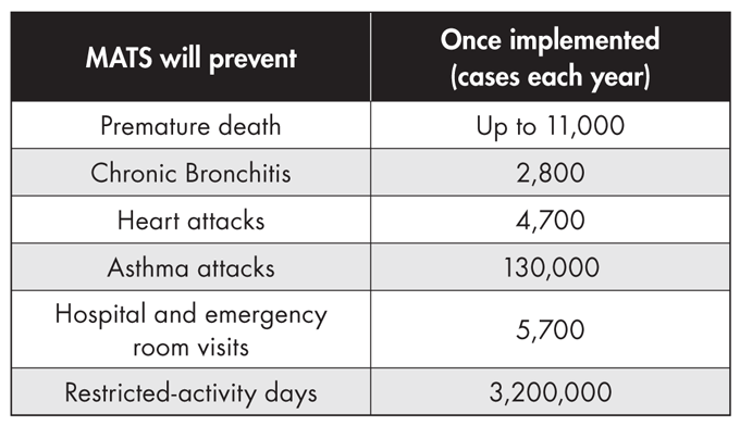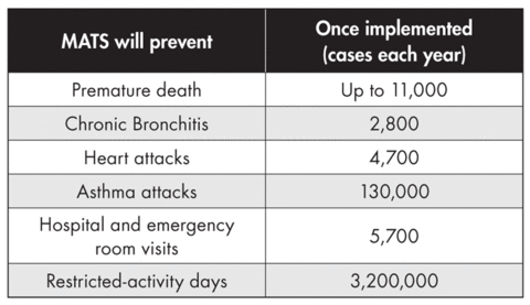 By Paula MeltonIn a monumental final rule issued near the end of 2011, the U.S. Environmental Protection Agency (EPA) finalized the first federal regulations for curbing mercury emissions and other toxic air pollutants produced by aging coal- and oil-fired power plants. The Mercury and Air Toxics Standards (MATS) will cut mercury emissions from power plants by 90%, acid gas emissions by 88%, and SO2 emissions by 41%, according to the agency. MATS aims to improve public health not only by reducing toxic air pollution but also by decreasing the amount of mercury that settles in waterways and bioaccumulates in fish—a phenomenon that can cause neurological damage in humans when they eat tuna and other predatory species. Utilities have four years to either shut down non-compliant plants or install pollution controls. EPA estimates the new rule will create 46,000 construction jobs and 8,000 utility jobs while raising electricity prices approximately 3%.