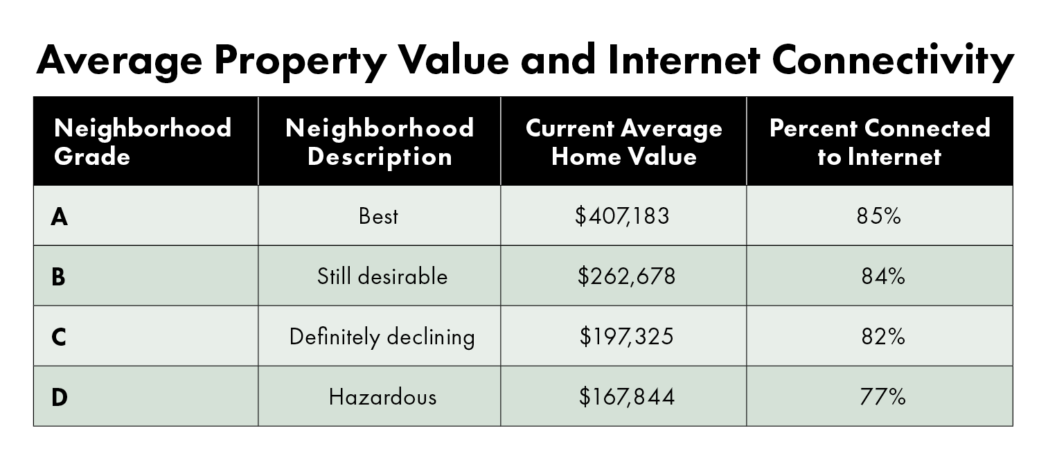 Although internet connection is not always correlated with income, in urban areas it often is, according to Wade, and the lower levels of connectivity in formerly redlined areas indicate reduced ability to, for example, succeed in school.