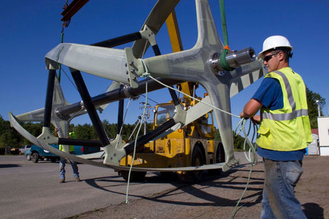 A construction worker readies a turbine for placement in ORPC's tidal energy generator in Eastport, Maine.