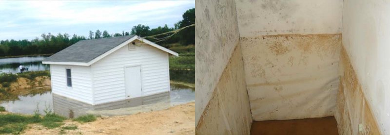 Photos show the test home during (exterior) and after (interior) three weeks of flooding.