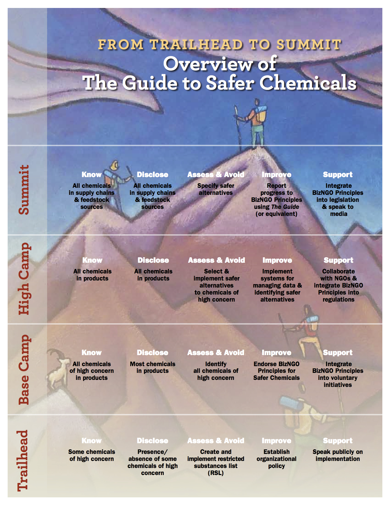 Viewing the path to safer material chemistry as a journey that begins at a “trailhead” and ends at a “summit,” the guide provides four principles for safer chemicals—know and disclose product chemistry; assess and avoid hazards; commit to continuous improvement; and support public policies and industry standards for safer chemicals. The guide offers a clear framework for achieving each goal and provides real-world examples of how different companies have attained different levels of progress.