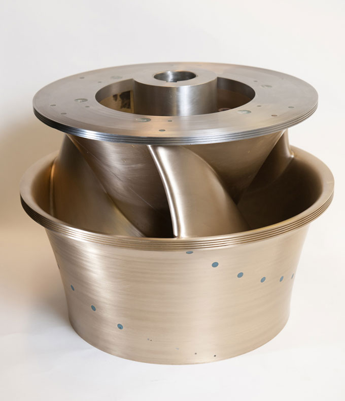 The three-blade Alden hydroelectric turbine achieves high generation efficiency while allowing fish to pass through unscathed.