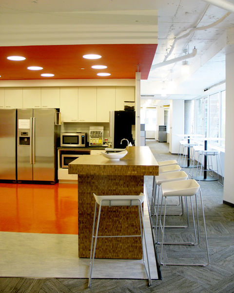 The kitchen in USGBC’s new headquarter features reused granite countertops and natural daylighting.
