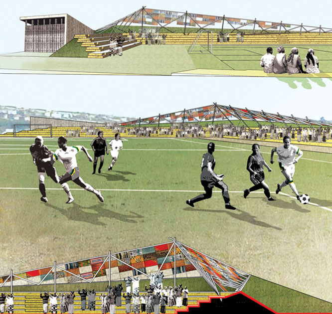 Swee Hong Ng’s soccer stadium design aspires to create a space that will bring the community together in participation and celebration. The Siyathemba football pitch is envisioned as a stage for events.