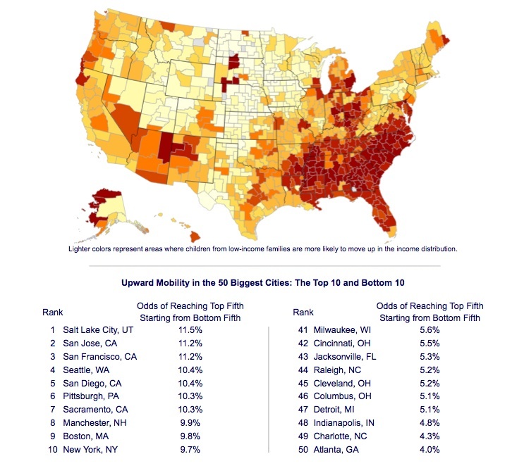 The Equality of Opportunity ProjectA child in the bottom fifth of income earners in sprawling Atlanta or Charlotte had a 4% chance of climbing to the top fifth of earners, while a poor child in denser Salt Lake City or San Francisco had an 11% chance.