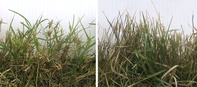 Bermudagrass (left) is a non-native grass with “tree-like” growth requiring frequent mowing to maintain density. Buffalograss (right), a native species, maintains density with less mowing, because the stalks don’t branch; it also grows more slowly.