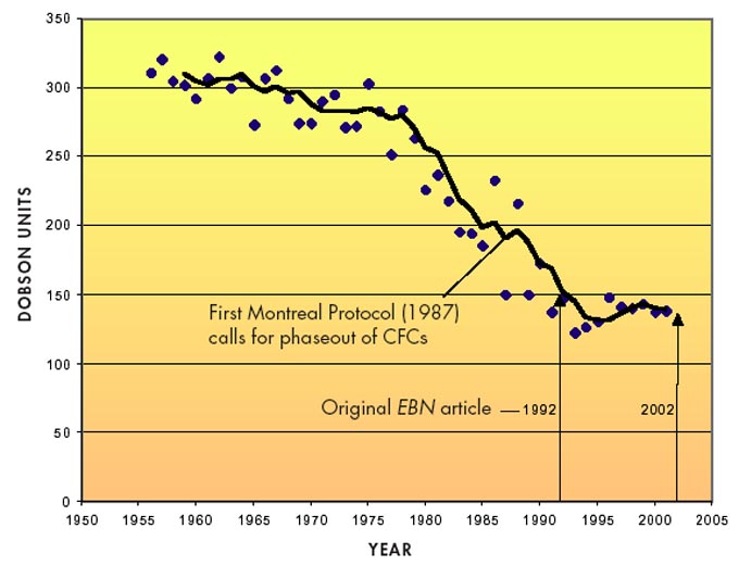 One of the most measurable impacts of ozone depletion is the ozone hole above the Antarctic that was first reported in 1985. Recent data from the British Antarctic Survey (see graph below) shows that the annually appearing reduction in ozone levels (measured in Dobson units) appears to be leveling off, consistent with UNEP/WHO projections. Most scientists are unwilling to project how quickly the stratospheric ozone layer will recover, however—the drop in halogen levels in the stratosphere might be slower than the buildup had been.