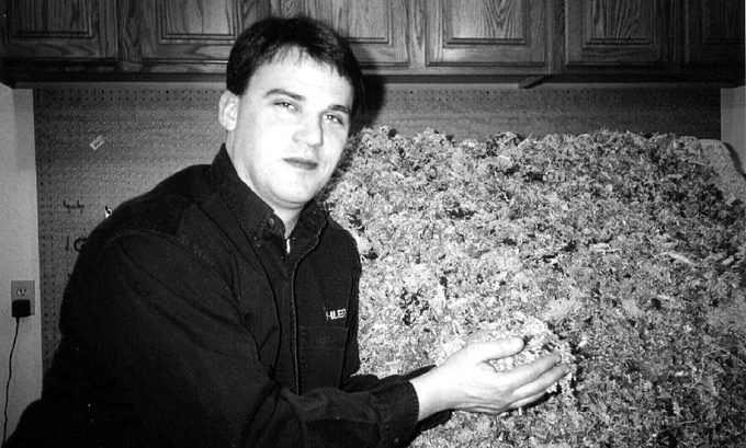 Inventor Tom Deem with some freshly shredded carpet insulation.