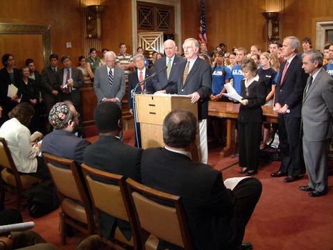Senator Jim Jeffords addresses a rally for the Global Warming Pollution Reduction Act with (from left) Senators Frank Lautenberg, Daniel Akaka, Patrick Leahy, and Barbara Boxer.