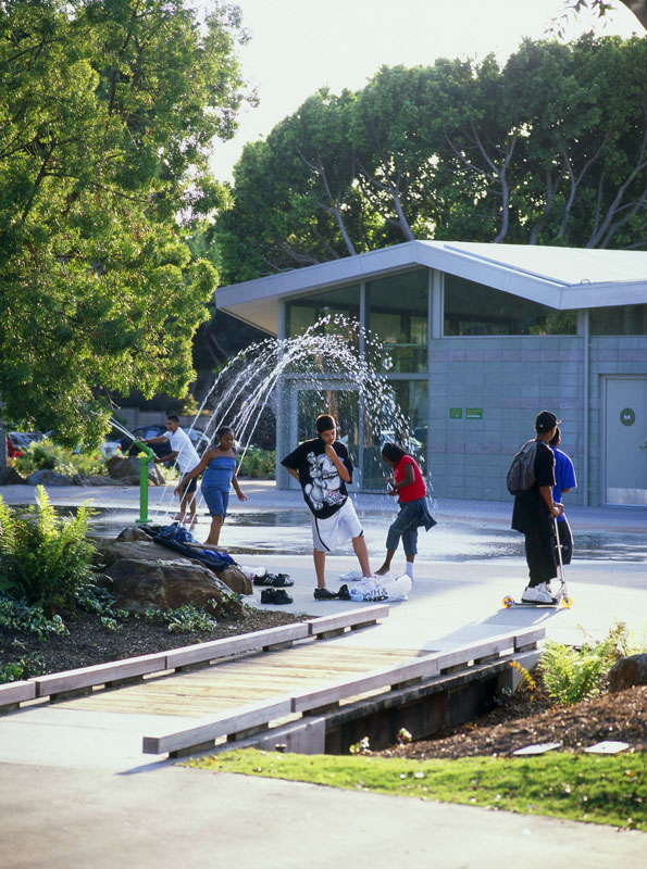 Virginia Avenue Park in Santa Monica, California, uses systems that capture and re-infiltrate rainwater for its irrigation needs and this fountain.